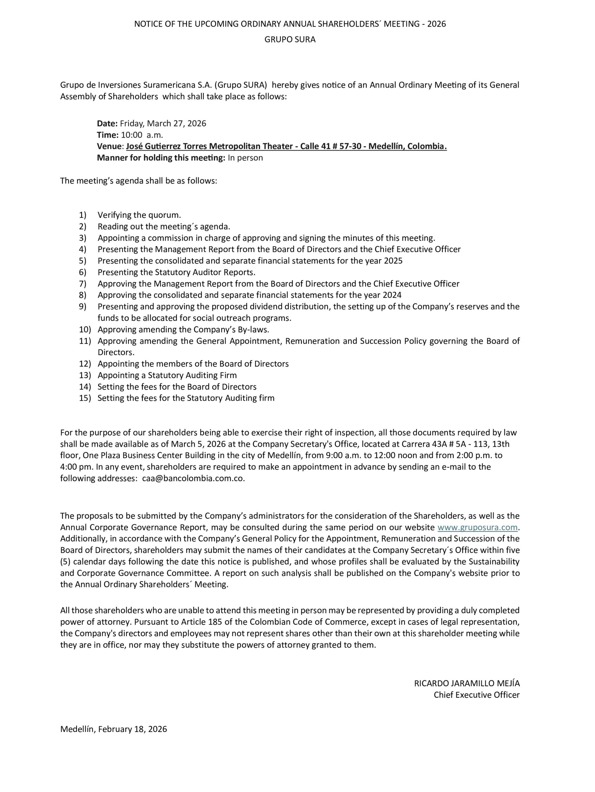- That today a notice was published in the El Colombiano newspaper, calling for the Annual Ordinary Meeting of the Company’s General Assembly of Shareholders, to be held on March 27, 2026