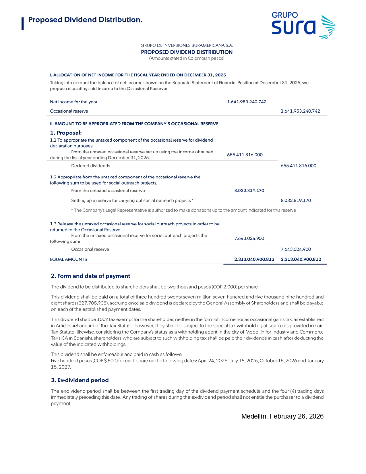 In compliance with our relevant information duties, Grupo de Inversiones Suramericana S.A. (hereinafter "Grupo SURA" or the "Company") hereby announces that the Board of Directors, at a meeting held today, approved the proposed dividend distribution corresponding to the year 2025, which shall be submitted for the consideration of the General Assembly of Shareholders at their upcoming Annual Meeting to be held on March 27, 2026.